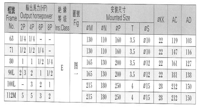 特点:1采用E级绝缘及高级导电材料,温升低,寿命长,性能优越 2外型轻巧,坚固耐用3优越的设计,噪音低,运转安静 4 启动转矩大,惯性小,运转顺畅,省电效果较佳,马达强劲有力。5特性合乎国家CNS及各项国际认证等标准。6标准IEC公制尺寸,具有互换性,适合各界需要