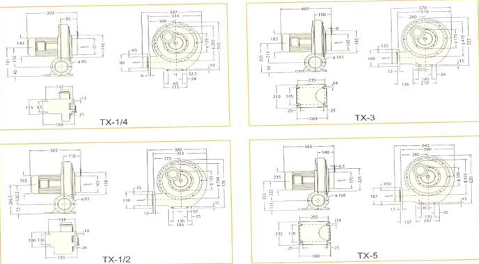 TX鼓风机特点1:小型重量轻,高风压。前侧式叶片设计,体积小,质量轻且较有高压力之产生。