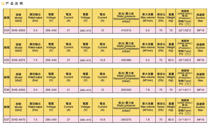 双段鼓风机EHS6355/6375本产品高风压,大流量,低噪音,无油污染,品质稳定,交货快,价格合理,是您的首选! 特点: 小型.重量轻.高风压前倾式叶片设计,体积小、质量轻较有高压力之产生。低噪音新设计,能消除切风时生之高频及特昳之消音材质,大幅降低噪音比。 低震动叶片均经过电脑平衡校正与高精密的机械加工,使震动降到最低。